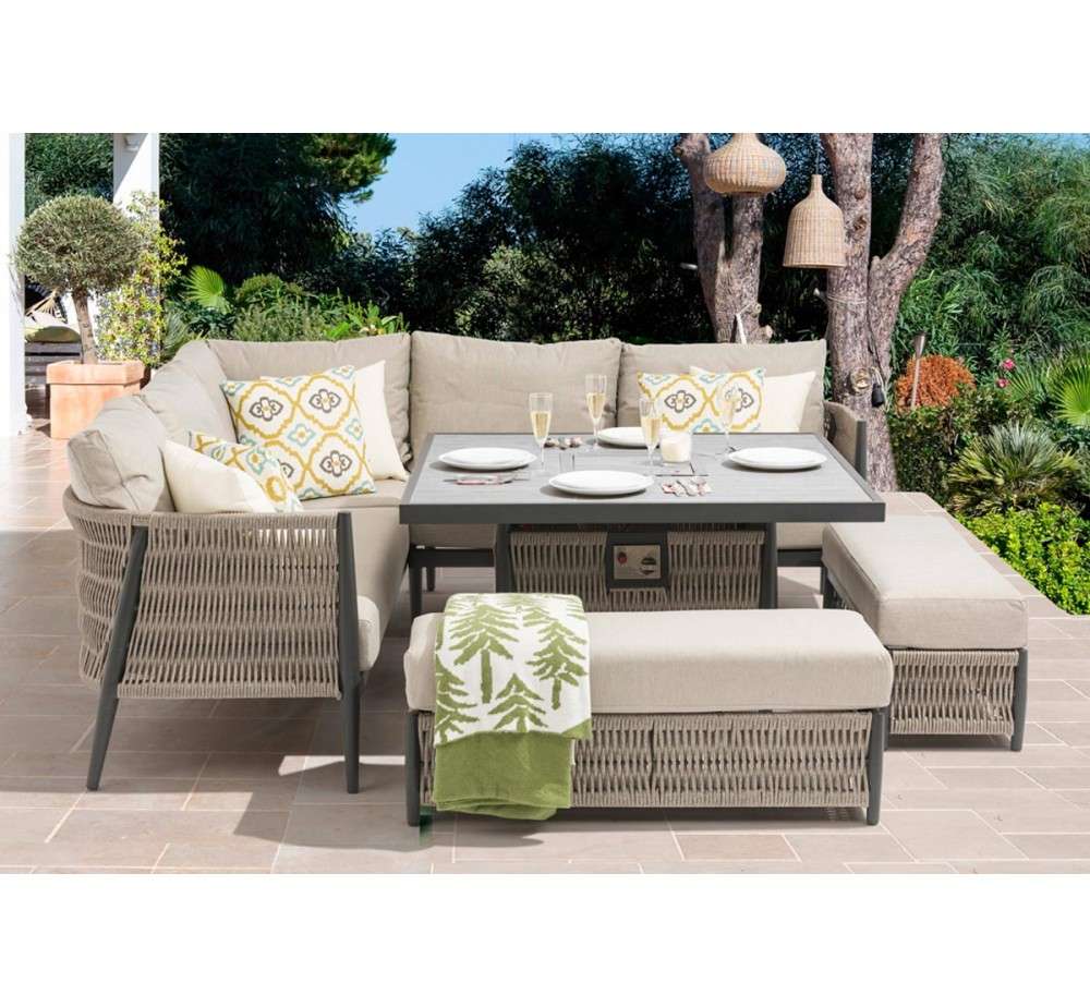 Δημιουργήστε την απόλυτη εμπειρία φιλοξενίας στον εξωτερικό σας χώρο με το γωνιακό σετ τραπεζαρίας Como. Ο κομψός σχεδιασμός του σετ συνδυάζει άνεση και πολυτέλεια, με γωνιακό καναπέ-τραπεζαρία, ένα τραπέζι με ενσωματωμένη εστία φωτιάς (firepit) και επιπλέον σκαμπό, προσφέροντας χώρο για όλη την οικογένεια ή φίλους.Το τραπέζι διαθέτει firepit με ρυθμιζόμενη φλόγα, γυάλινο προστατευτικό ανεμοθώρακα και κρυφό αποθηκευτικό χώρο για τη φιάλη. Ο σκελετός αλουμινίου και το μοντέρνο rope design εξασφαλίζουν αντοχή, ενώ τα αφαιρούμενα μαξιλάρια προσφέρουν άνεση και ευκολία στον καθαρισμό.Χαρακτηριστικά: Κατάλληλο για 6 έως 8 άτομα Γωνιακός καναπές με εργονομικό σχεδιασμό Τραπέζι με ενσωματωμένο firepit υγραερίου Ρύθμιση έντασης φλόγας και γυάλινο προστατευτικό Κρυφή αποθήκευση φιάλης κάτω από την επιφάνεια Αλουμινένιος σκελετός και ανθεκτικό υφασμάτινο σχοινί (rope) Αφαιρούμενα, πλενόμενα μαξιλάρια με αδιάβροχη επένδυση Μοντέρνος σχεδιασμός σε γκρι/μπεζ αποχρώσεις