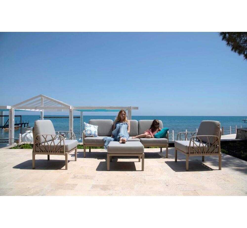 Η ανάλαφρη πλέξη σπάει την κλασική γραμμή προσδίδοντας ιδιαίτερη κομψότητα. Στιβαρός σκελετός από πολυπροπυλένιο ενισχυμένο με fiber glass και UV πρόσθετα. Πλούσια και αναπαυτικά μαξιλάρια πάχους 12 εκ. το συνοδεύουν. Φιλικό προς το περιβάλλον αλλά και τους καλεσμένους μας!
