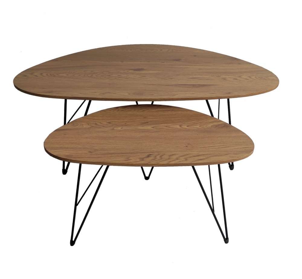Μοντέρνο σετ με δύο τραπεζάκια σαλονιού σε διαφορετικές διαστάσεις για το σπίτι, αλλά και για αίθουσα αναμονής γραφείου, ιατρείου, σχολείου κλπ.Μεταλλικός σκελετός με resin προστατευτικά πέλματα για το δάπεδο.Επιφάνεια από MDF σε σχήμα τόξου με οβάλ απολήξεις σε φυσικό ή μαύρο χρώμα.