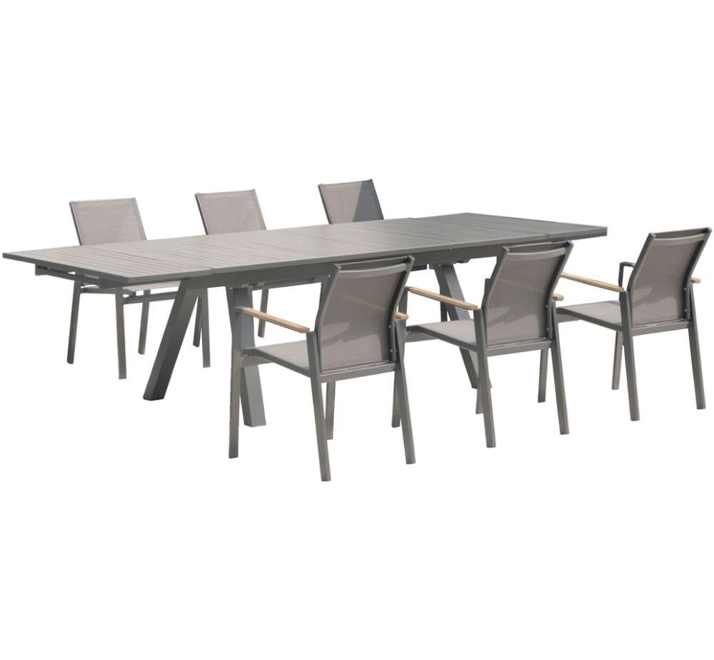 Η τραπεζαρία Miro συνδυάζει μοντέρνα αισθητική με κορυφαία ποιότητα κατασκευής. Με σκελετό από ανθεκτικό αλουμίνιο και εργονομικό μηχανισμό επέκτασης, προσφέρει ευελιξία για κάθε περίσταση – από καθημερινά γεύματα μέχρι δείπνα με φίλους και οικογένεια. Η κομψή γραμμή της την καθιστά ιδανική για εσωτερικούς και εξωτερικούς χώρους. Χαρακτηριστικά: Κατασκευή από αλουμίνιο – αντοχή στη φθορά και τις καιρικές συνθήκες Μηχανισμός επέκτασης για προσαρμογή του μήκους Διαθέσιμη σε μοντέρνα χρώματα Εύκολη συντήρηση και καθαρισμός