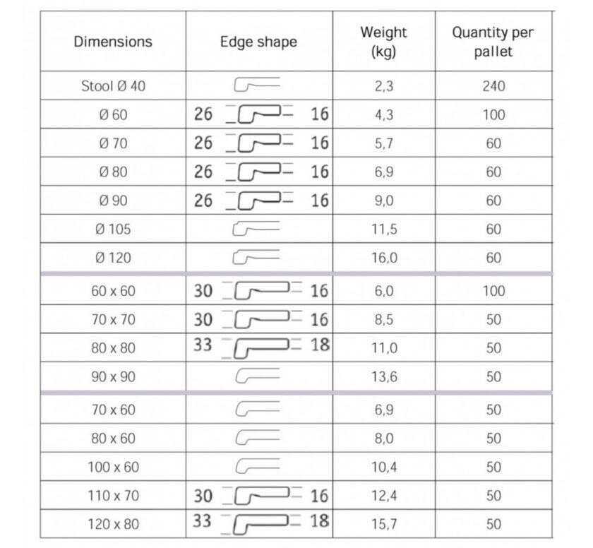 | Μέγεθος | Ø60cm, Ø70cm, Ø80cm, 60x60cm, 70x70cm, 80x80cm, 80x120cm |
